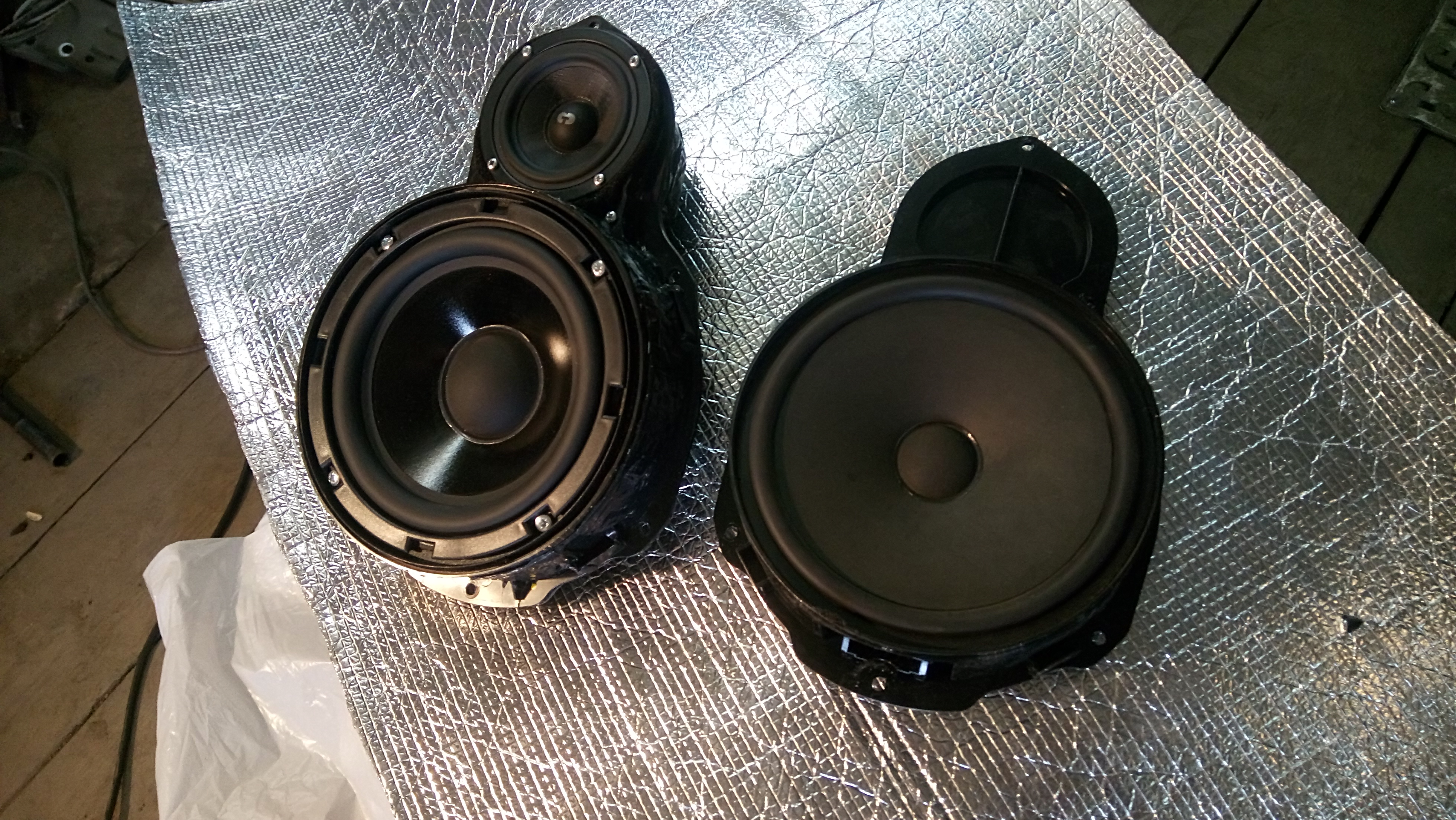 Использовать корпуса старых динамиков в качестве подиумов. Басовик подключить так-же как и старый.