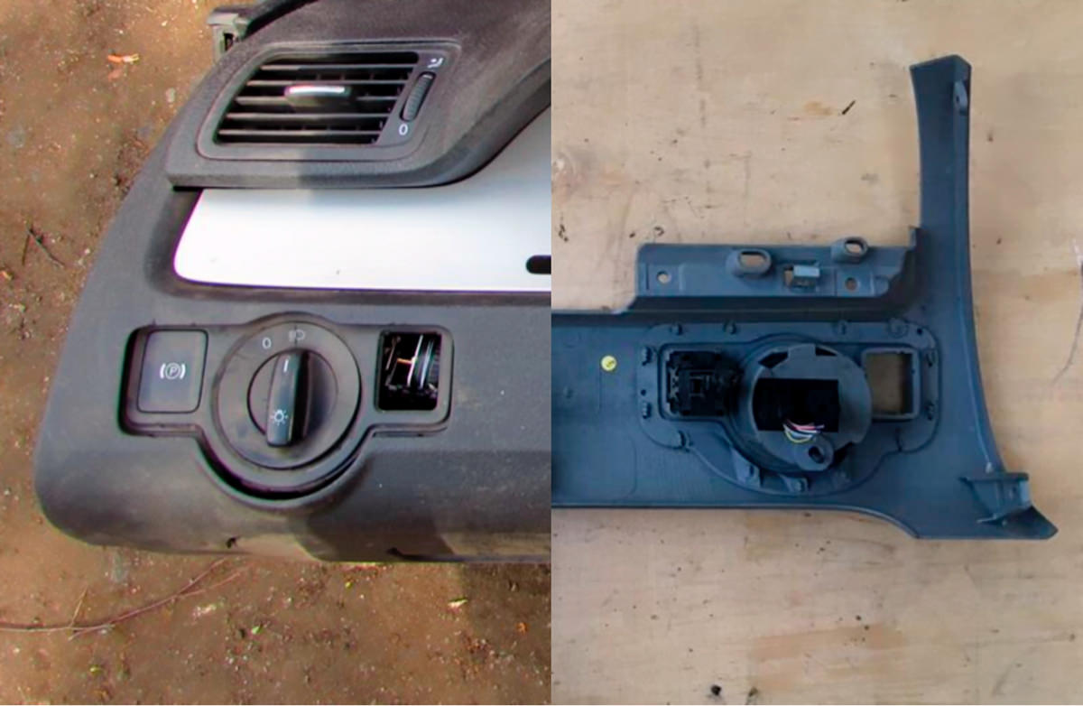 5. Вытаскиваем переключатель света - утопить ручку внутрь и покрутить буквально чуть чуть по часовой стрелке, после этого открываем ящик слева внизу и оттуда (изнутри) толкаем выключатель освещения к себе. Его отключить от разъема. Выкрутить 1 торкс под переключателем.