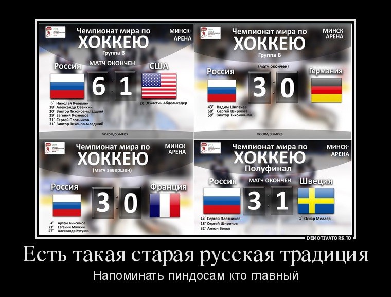 valent77 писал(а):5-2 - по ходу наш год. Олимпиада, Крым, Хоккей ждем продолжения.