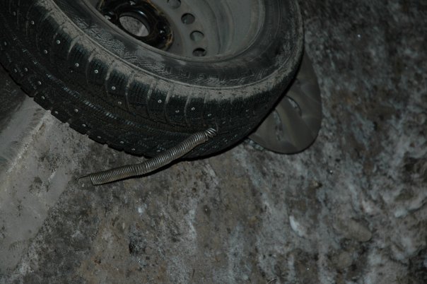вот и мои залеты болтяра 25 см пробил покрышку диск тормознои барабан + сами колодки
