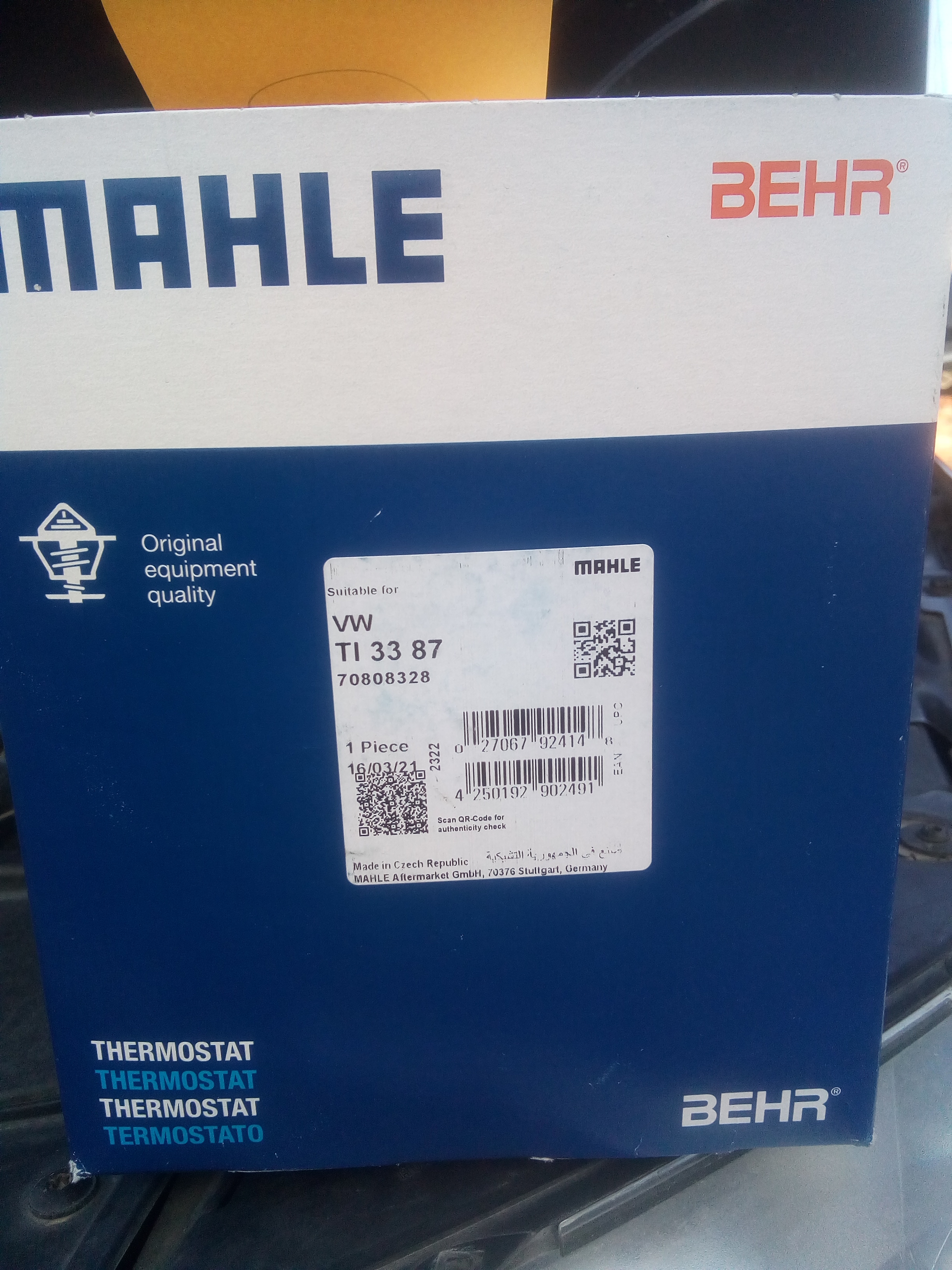х806хр писал(а):Ребята, Добого всем времени суток! Подскажите кто в курсе купил термостат manle-behr просто в коробке, без обёртки лежал со спилинным номером. Полагаю это либо оригинал или могли что-то подсуть туда, кто знает как должно быть?
