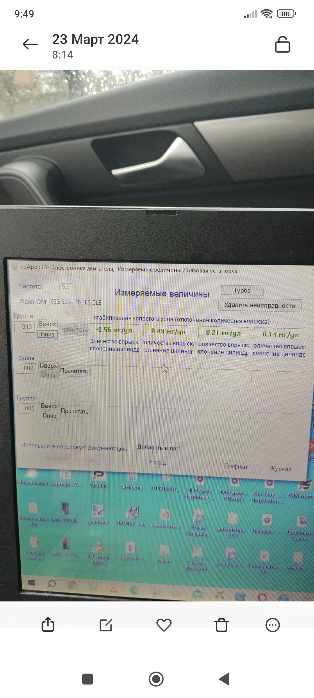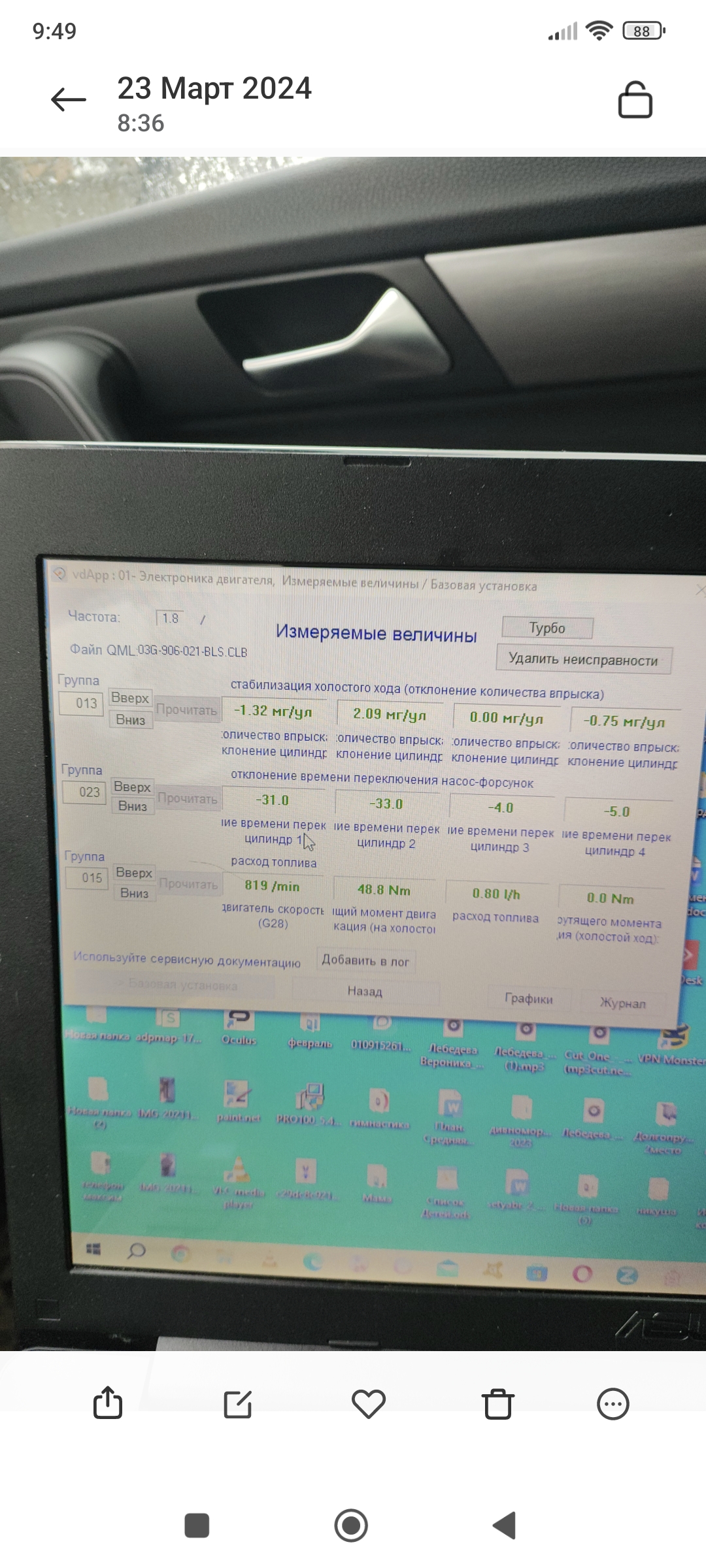 miwka77 писал(а):Померял группы 13, 15 и 23. Время переключения форсунок 0.21-0.22. На слегка остывшей машине, коррекция по 1-ой форсунке колеблется около 0.5, по остальным 0.1-0.3. Расход показывает комп 0.9. Прокатился по трассе и остановился. Коррекция выровнялась на значение 0.1-0.2, при этом расход упал до 0.7. Но на 0.6 уже не падает с осени прошлого года. Осенью как раз менял в VAG-Сервисе ГРМ.Маленький вопрос знатокам: в 15 группе (расход топлива) есть значение расхода топлива в ед. л/ч. Что это за значение? Когда по компу расход 0.9 - в ВАСЕ это поле 1.45Можно что-то сказать по моим данным? Стоит вообще заморачиваться с такими данными?