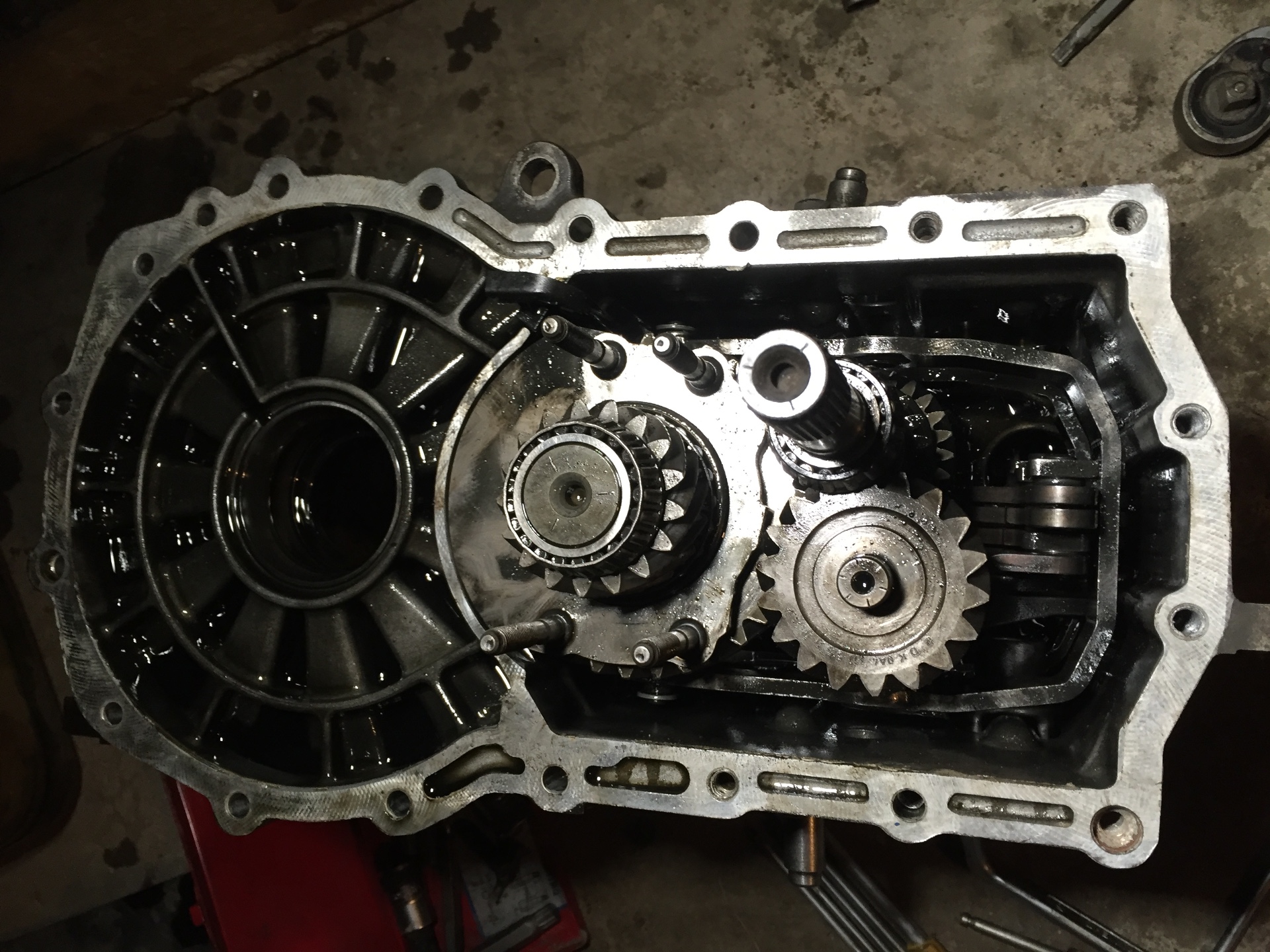 В эту коробку заливается 2,1 литра (при полном разборе), и 1,9 при обычной замене.
