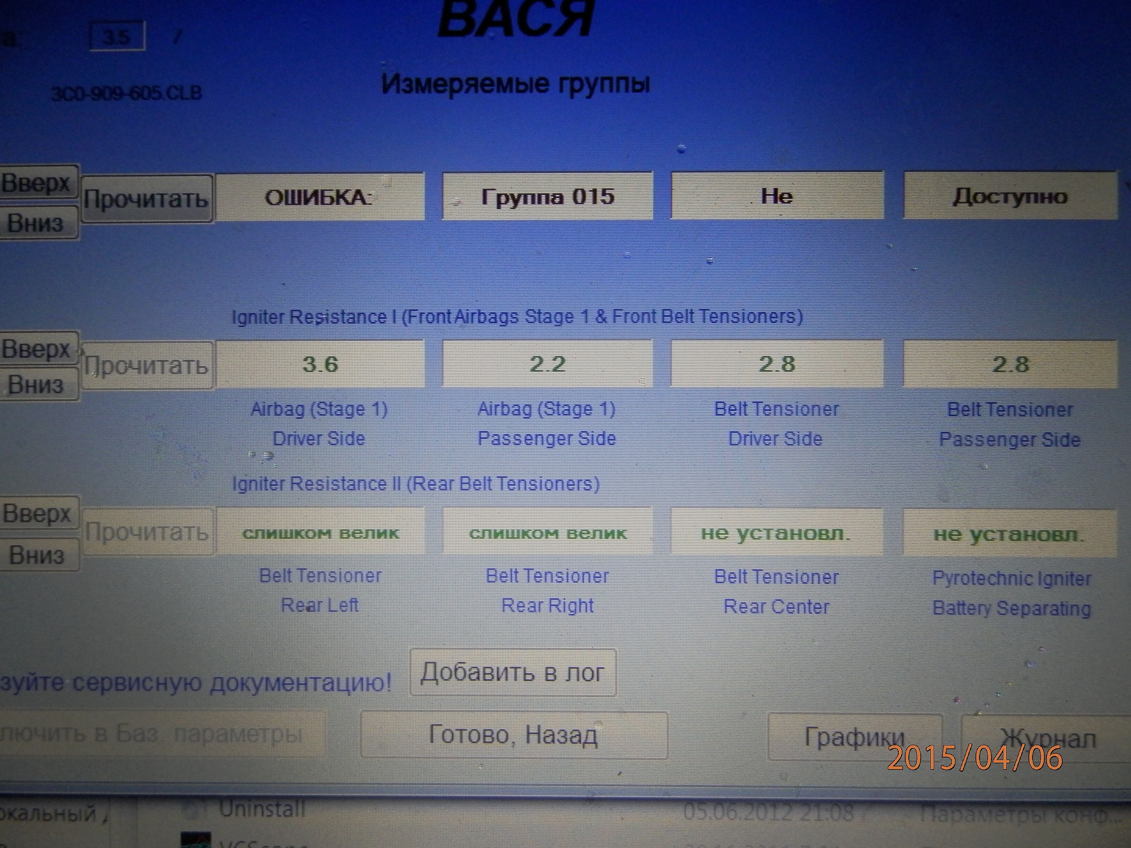 Максимус писал(а):Ребята посмотрите пожалуйста у кого блок подушек (3C0 909 605 J) значения : подушки безопасности гр.15, 21,22 скиньте суда для сравнения , или расшифруйте за что отвечают эти группы и какие должны быть там значения и надписи за ранее благодарен