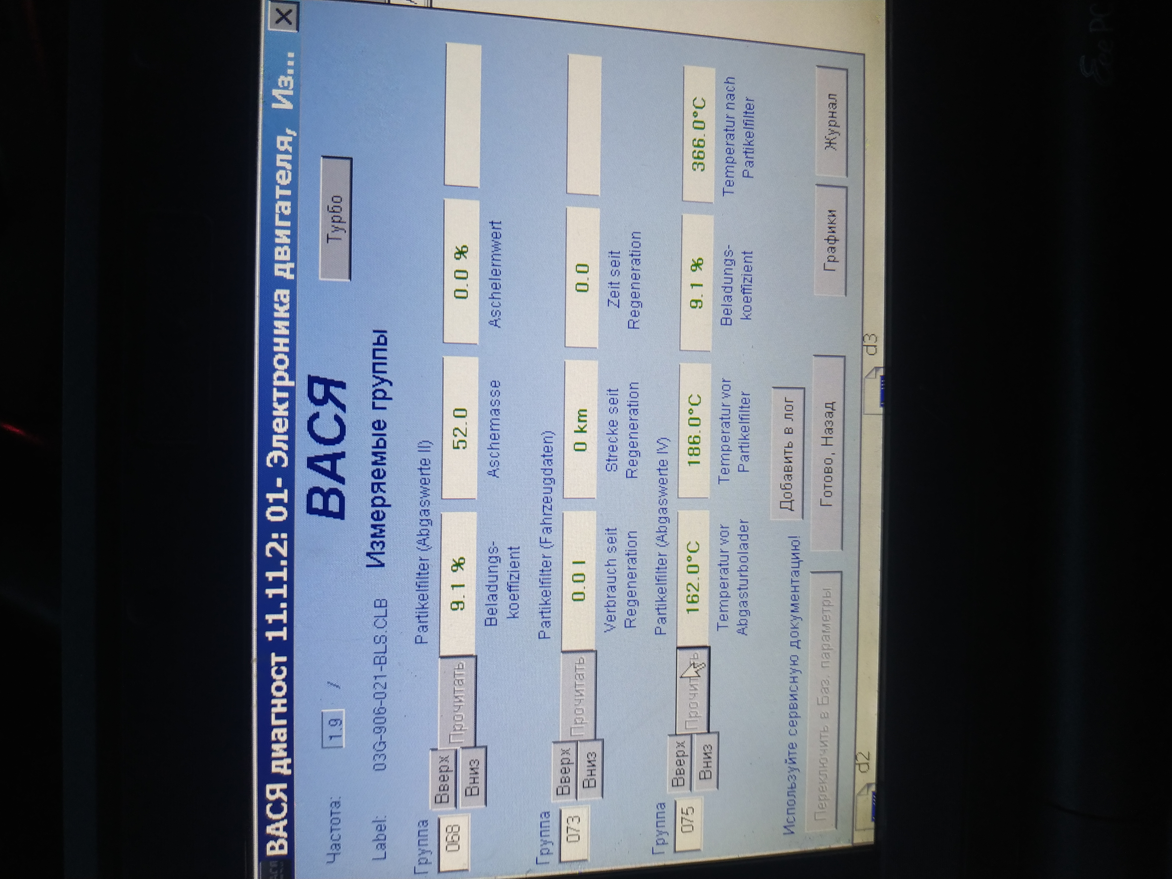 73 группа, 1 окно - литров сожжено с последней регенерации фильтра, 2 окно - сколько км назад была регенерация.