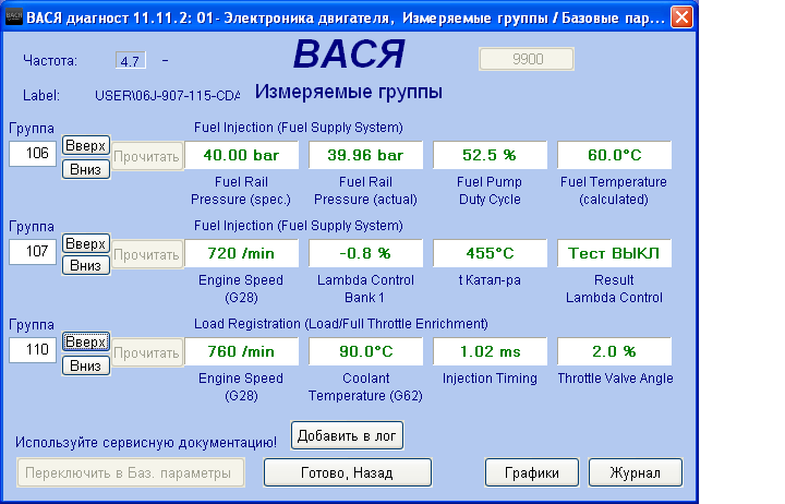 Думал проверить давление высокого и низкого топливных контуров, это группы 230 и 103. В Вагкоме не могу такие найти - 103 нет, и всё заканчивается на 200. Есть 106 (высокое давление, фактическое), и всё.