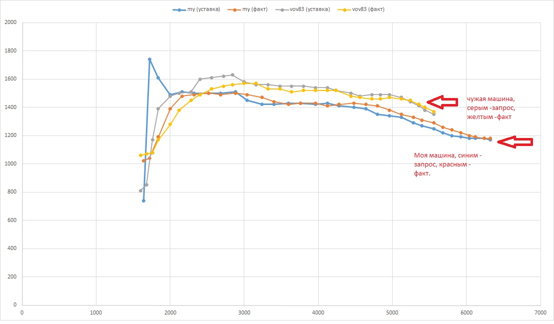 Графики запроса наддува и факта наддува совпадают, НО! запрос наддува меньше других машин в полке примерно на 0.2бар.