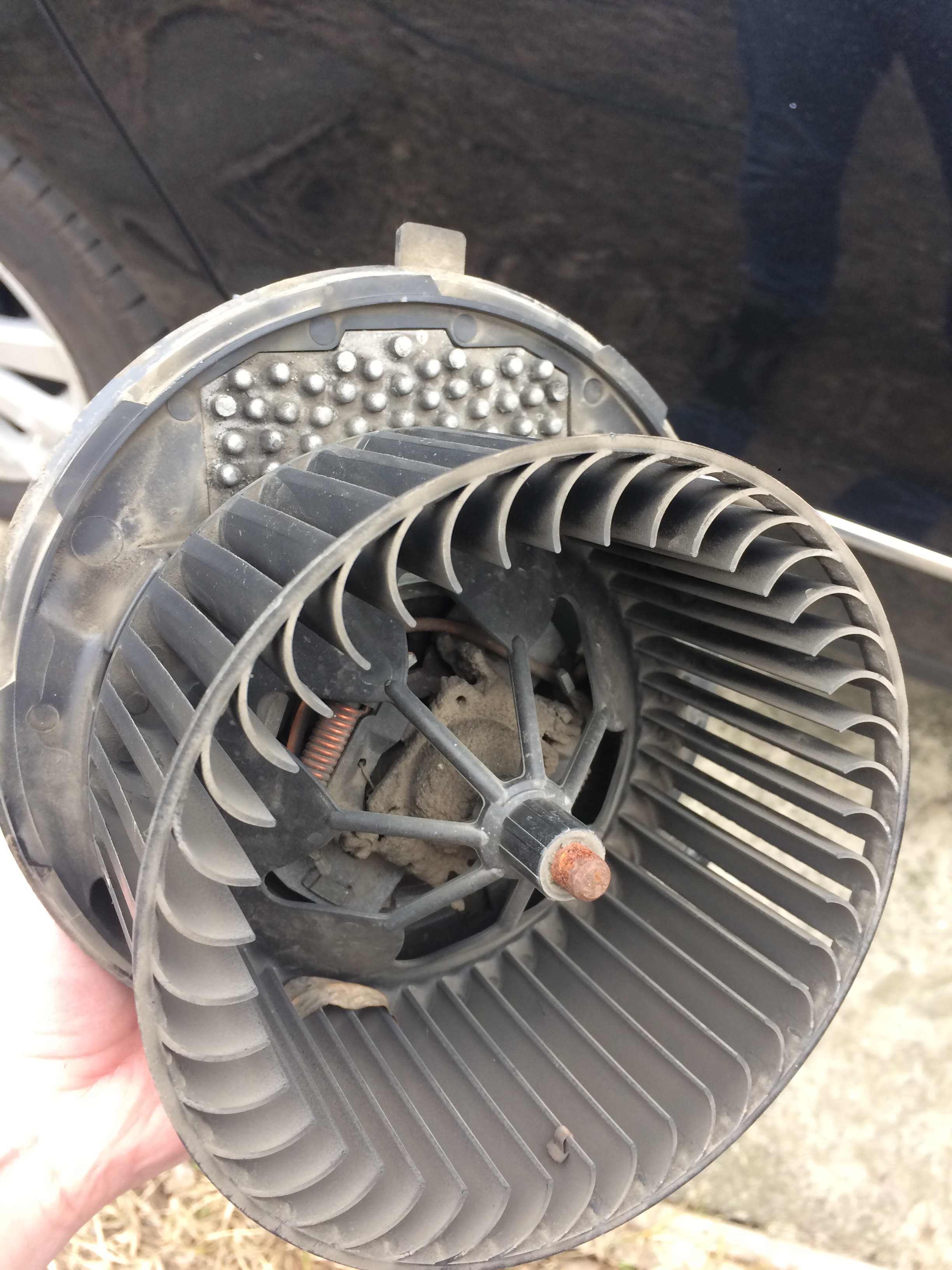методом отключений и включений вычислил моторчик печки. Включаешь, может запуститься, а может нет. Причём если не начинает крутить - начинает вонять. Отвёртку в руку, снимаем. Подозрение конечно на подклинивание подшипников, однако год назад делалась ревизия и всё смазывалось. Визуально всё живое и поводов для "клина" нет. Подсказал знакомый электрик - выработка контактных площадок на якоре, так и оказалось. Был недорого куплен мотор с практически новой распиленной праворукой Audi A3, где под замену пойдёт шляпа и крыльчатка, плюс переустановка щёток по направлению вращения с перепайкой полярности.