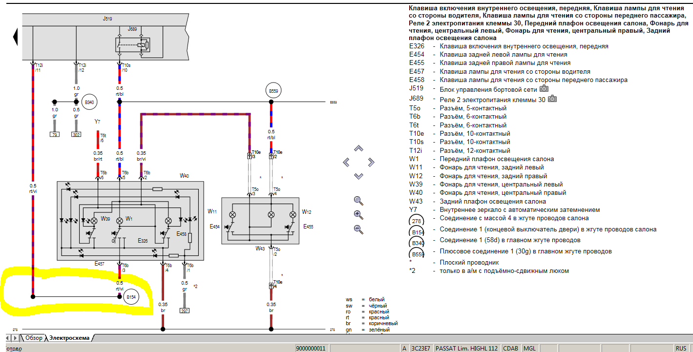 Схема плафона. Проверять связь между плафоном и блоком бортовой сети. Появляется ли там ноль ри открытии дверей. (обведено желтым)