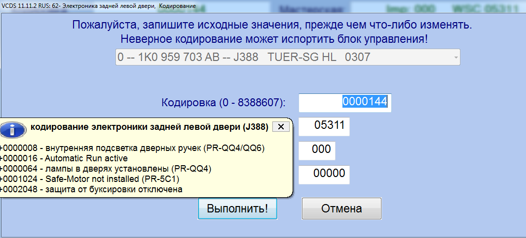 Короче воткнул в 6+и в 18-.зашел в 72 блок задней правой двери прибавил 64.было 0000144 поставил 0000208. Сохранил . Кодирование принято . Но не загорается :evil: