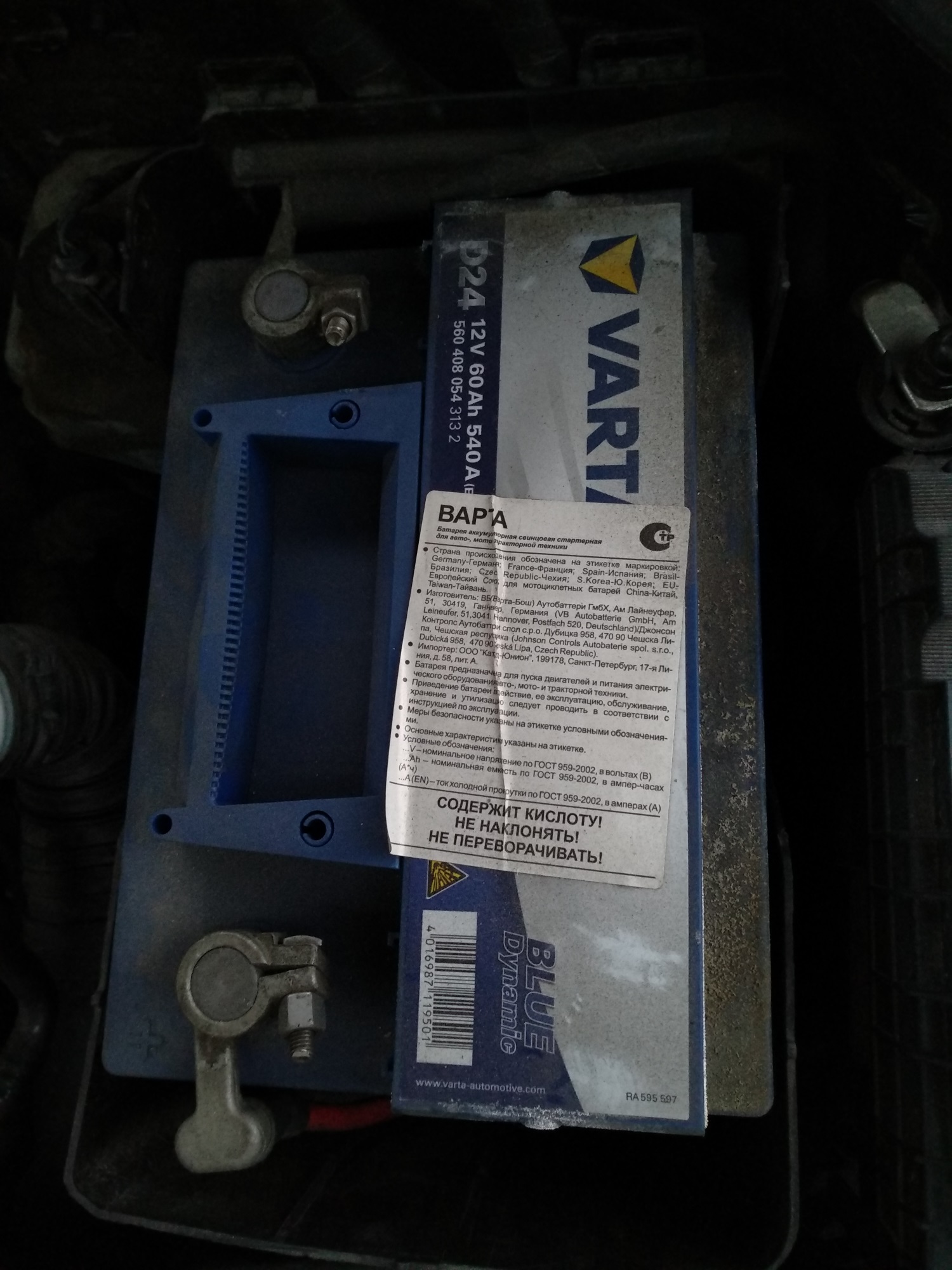 К слову о моём старом аккумуляторе. Это была Varta D24, отслуживший почти 3 года. По выбитой маркировке (C7C459....) уже можно точно сказать, что сделан он был в Чехии (Чешска Липа) в ноябре 2014 года. За всё время эксплуатации совершенно точно не подзаряжался ни разу. Абсолютно без замечаний заводил авто ранее в двадцати пяти и тридцати ° морозы, за что ему спасибо. Вот, кстати, он