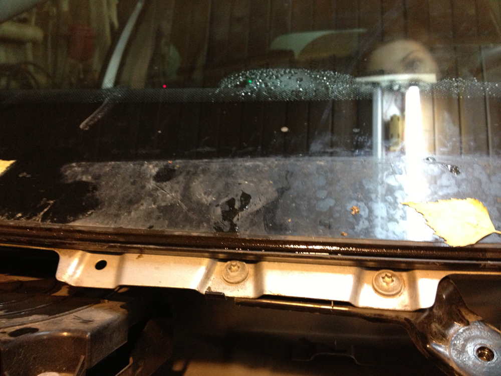 В итоге переклеил лобовое стекло. Когда сняли внутренние накладки со стоек и начали лить воду на крышу с левой стороны лобового стекла (почти в углу), начала появляться вода. Когда стекло сняли - оказалось что жадные немцы пожалели праймера и в этом месте его почти небыло.
