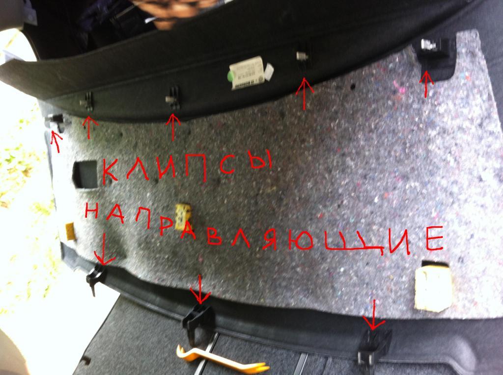 5) Теперь можно снимать полку она крепится в районе спинок заднего сиденья к металлическому каркасу под ней на 5-ти ромбовидных клипсах , её надо сначала поднять наверх к потолку и когда все 5 клипс отщелкнутся потянуть в сторону передних сидений ,т.к.на другой стороне полки в районе заднего стекла есть 3 пластиковых направляющих.