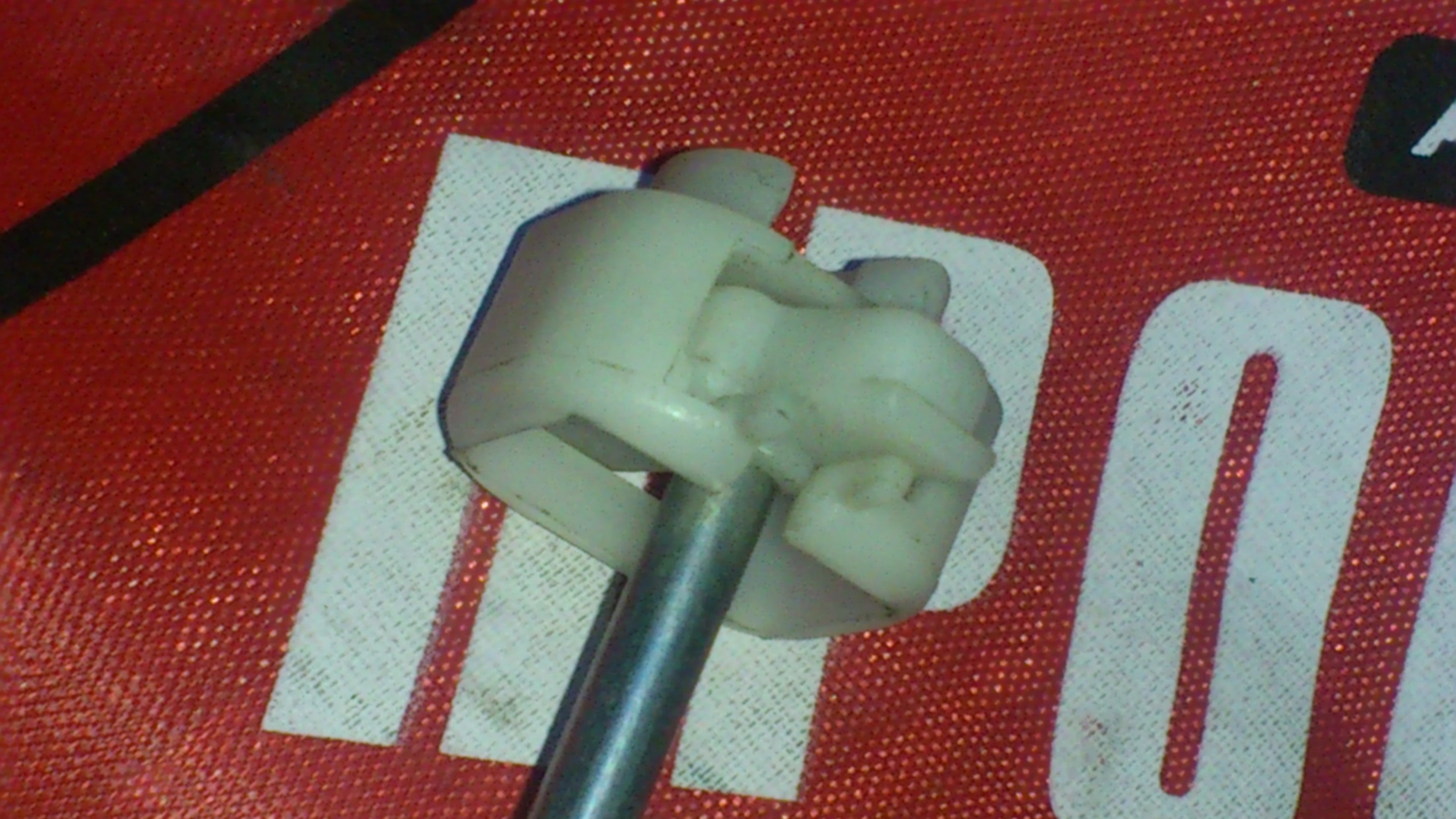 Я выкинул её нах... и поставил обычную клипсу(дырка и в обшивке и в кузове была,рядом со штырьком,ничего не сверлил).