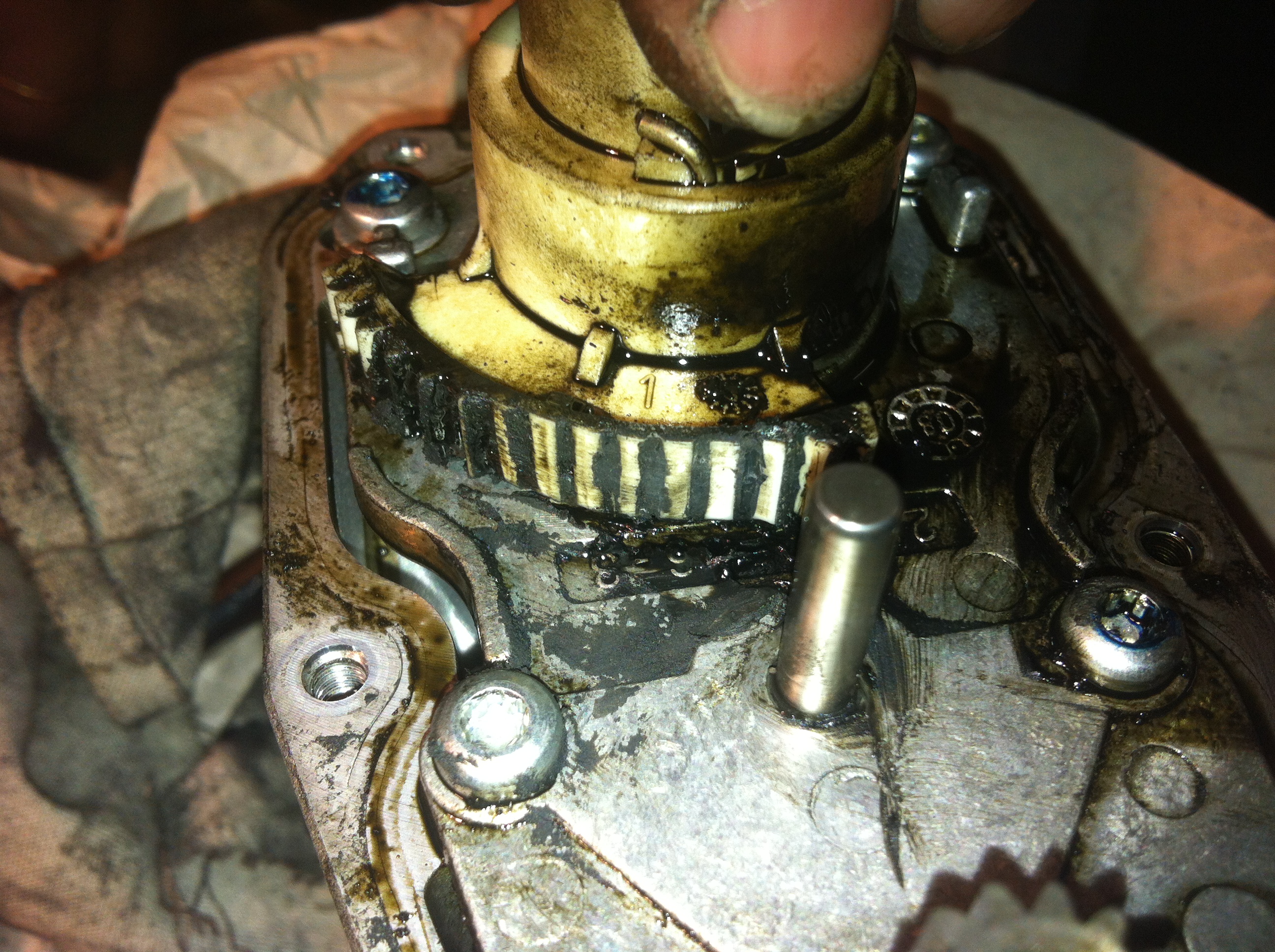 Снял черную крышку и опа, ВОТ она - моя проблема, сточенные зубья механизма управления самим клапаном! Можно было бы заколхозить, выточить такую качалку из металла, но самый банальный способ пойти купить новый, именно так я и сделал! Кстати, после того как была открыта черная пластиковая крышка, внутри было обнаружено изрядное количество масла. Которое попало туда через шток, по причине выработки или из-за неправильного газораспределения, но точно я сказать не могу. Но этот факт меня очень серьезно обеспокоил, так как масло находилось и в регулирующей заслонке которое через уплотнения вытекало вокруг.