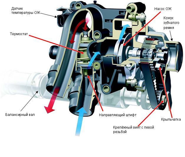 Только лишь термостат, датчик температуры и кожух ременной передачи можно заменить отдельно. Для правильной установки термостата на корпусе имеется направляющий штифт.