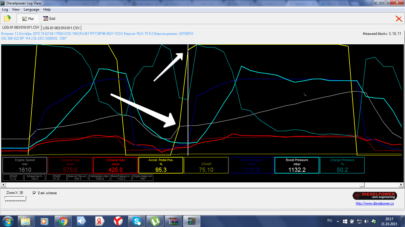 Лог №1: выделено стрелкой - газ в полу (желтый график) , сзади черный дым хуже тепловоза, обороты не поднимаются, воздух , я так понимаю даже не запрашивается (синий график)
