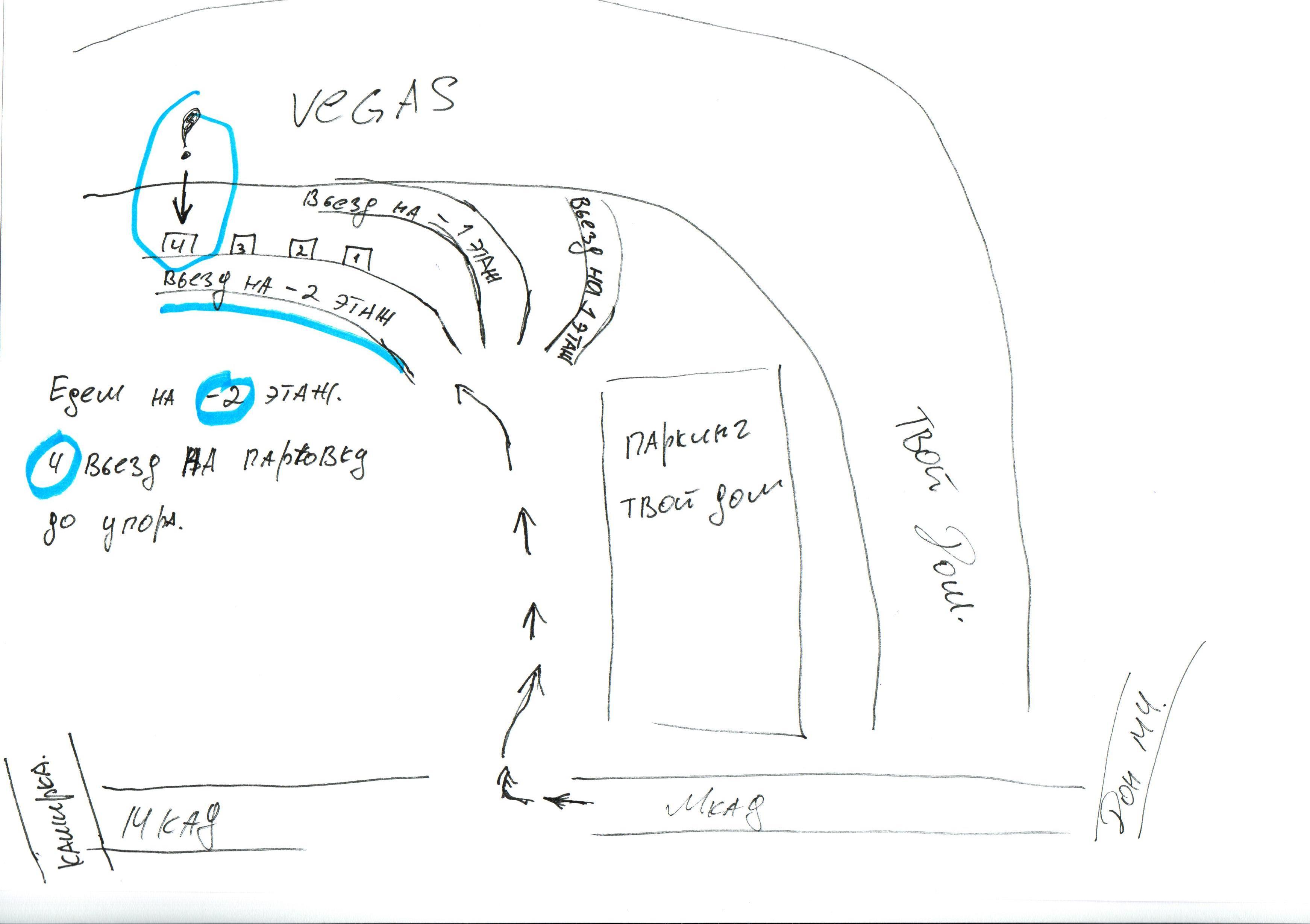 firstzamla писал(а):короче что бы не запутаться - предлагаю самый нижний уровень парковки (-2 этаж заезд слева. т.е. вы проезжаете открытую парковку "Твой дом", затем перед Вами развилка - самая правая - это заезд наверх к открытой парковке Вегаса, средняя это -1 этаж, а вот левая это наша -2 уровень.) Как спустились к вьезду на парковку - считайте заезды - 4 заезд наш. заехали и не куда не сворачивая до упора.