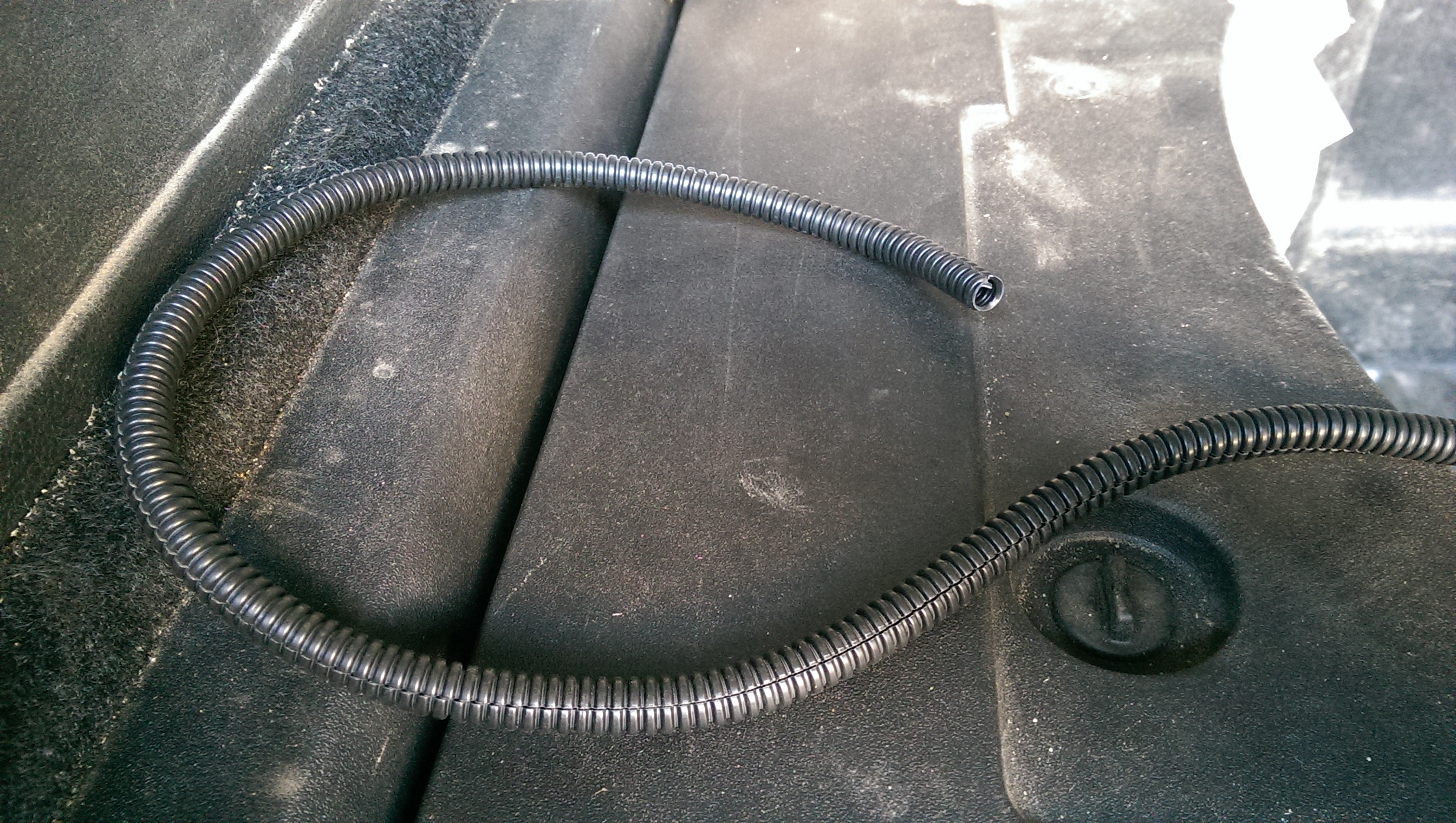Принял решение вскрывать обшивку, сдёрнул нижнюю с двери багажника, стал искать где пропадает напор. омывательвключается при открытой двери - опять же, на сколько я понимаю, косяк концевика. Омывайка поперла из под обшивки багажника с правой стороны, в нише за обшивкой, где блок парктроников лужа (кстати уже имел счастье как-то раз утопить его) - снимаем обшивку по багажнику дпльше, вплоть до панели которая держит потолок сзади. Течь нашлась из под обшивки крыши в районе петли, стал выпутывать трубку из пучка (два с половиной часа с осушением ниши, доставанием пробок из под панели которая закрывает полость под бампером и т.д.). трубка вышла двуми частями - видимо в морозы лопнула в районе петли. Срастить её не получается, гофру можно было даже не пробовать. буду менять, правда пока не знаю на что, может кто имел опыт.....