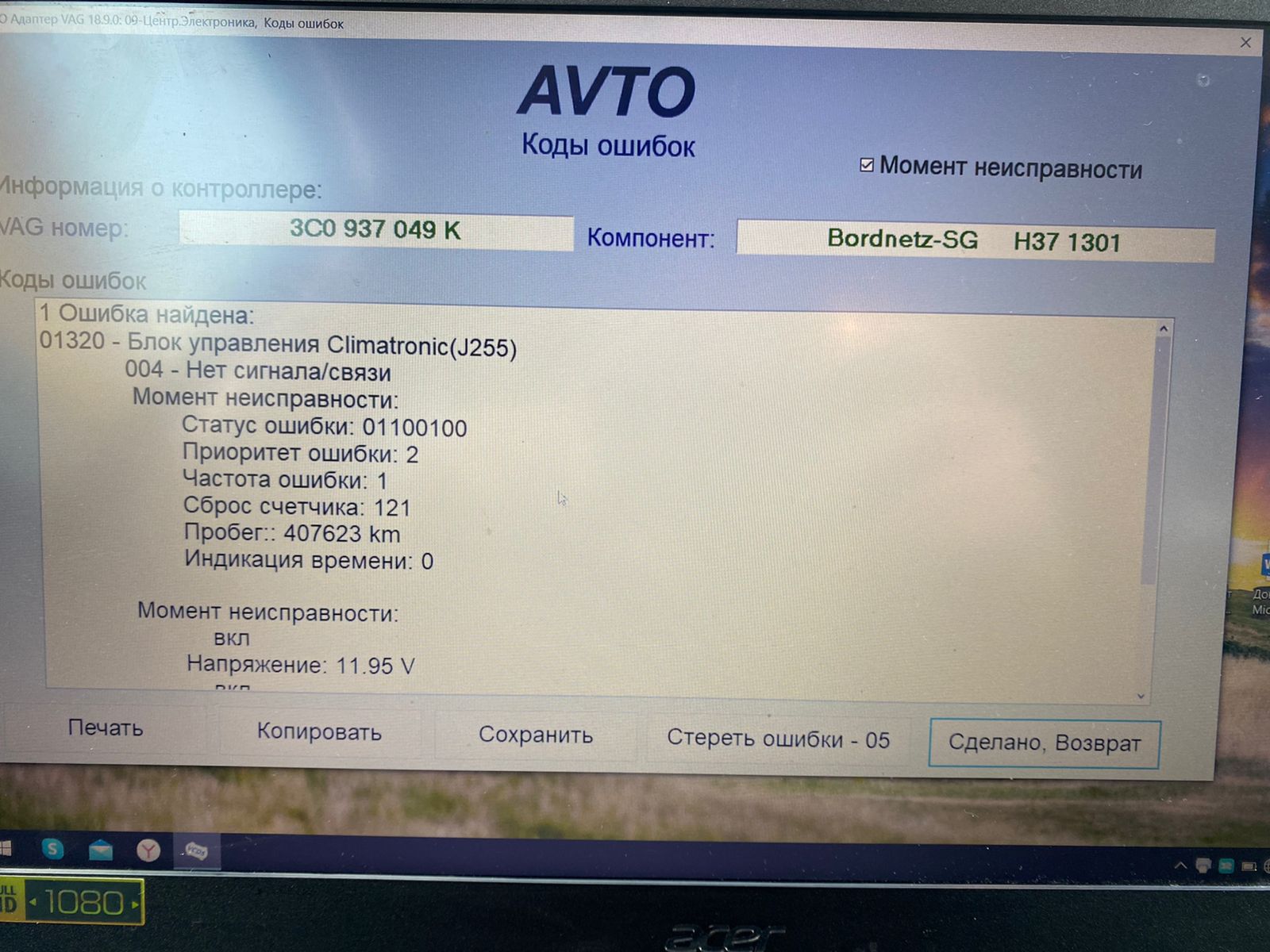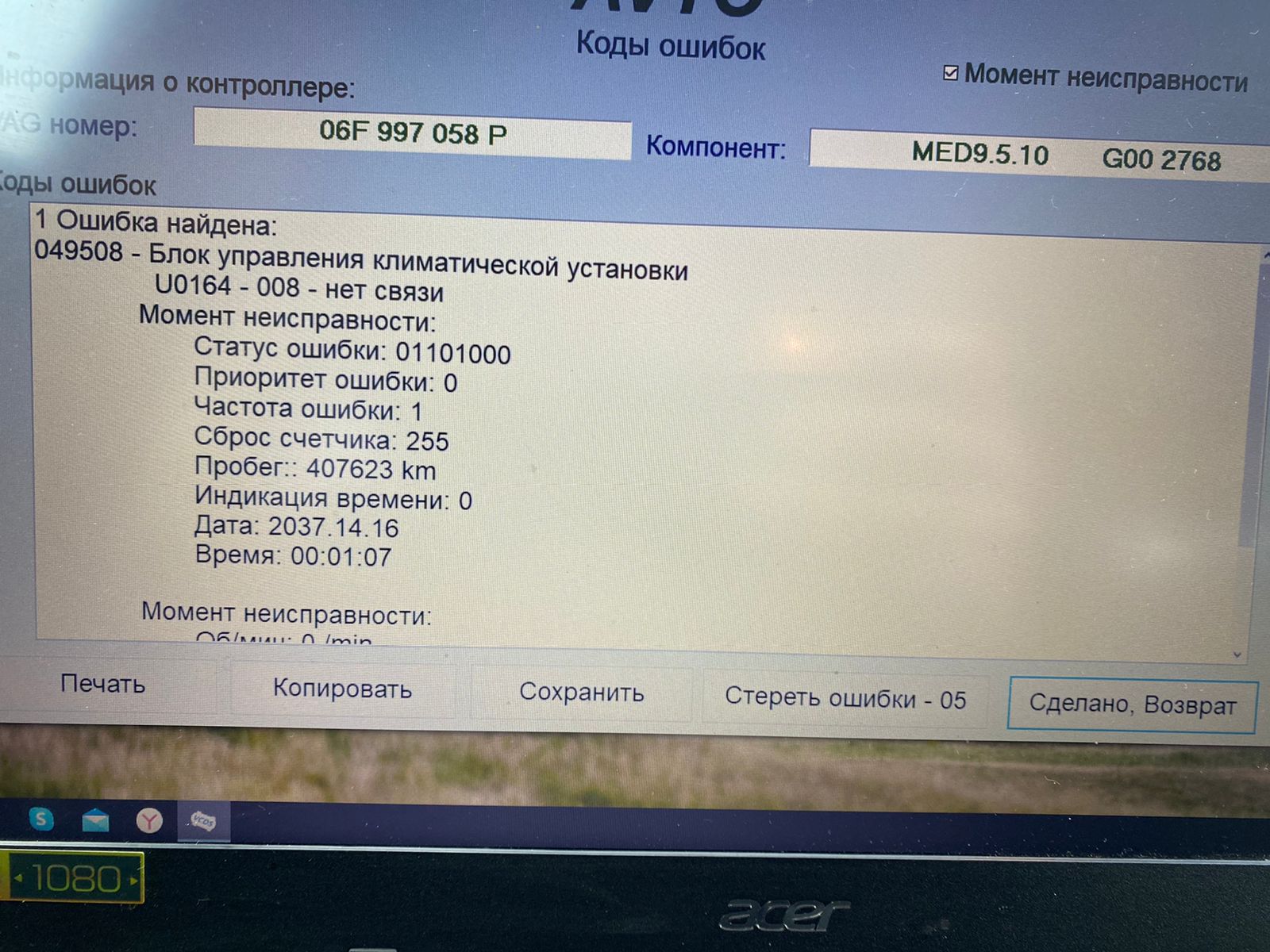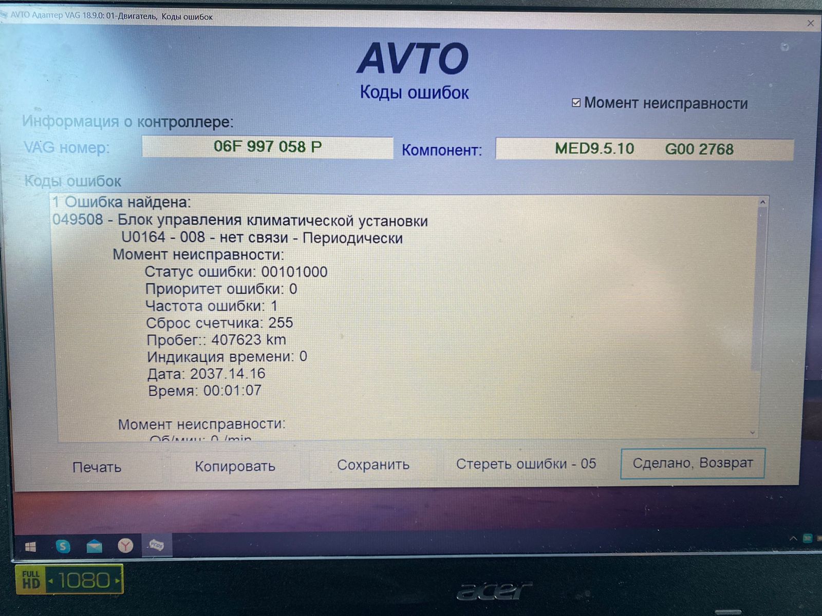 На новом климате все работает, так как печка дует я не стал смотреть предохранитель SC39 и пины 5 и 6 на 20 контактном разъеме, так как ошибок в 19 блоке не было. Единственная ошибка это шибка в блоке двигателя ( На фото) самая последняя фотографии