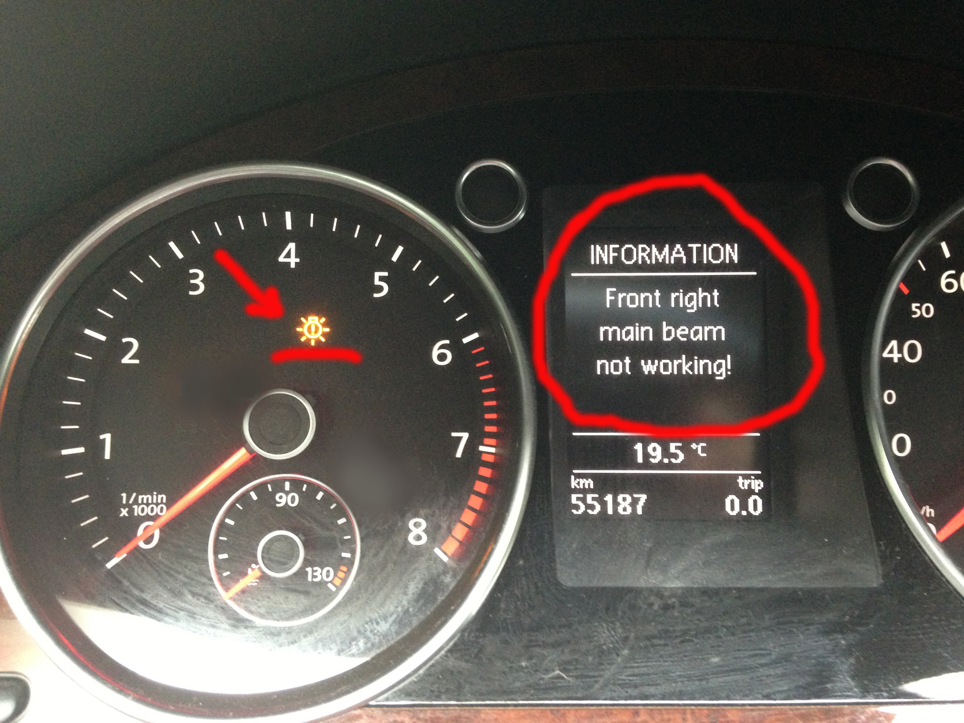 в салоне мне не до радости!на табло "front right main beam not working"