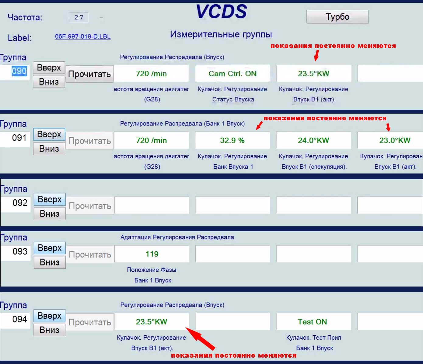 Решил проверить состояние мотора, а именно, натяжение цепи. Внимательно прочитал всю имеющуюся информацию на форуме, вооружился ноутбуком и приступил. При тестировании Vag-Com-мом посмотрел 93 группу. И... ничего не понял. По документам в этой группе должно быть видно значение величины растяжения цепи, так делали многие форумчане. У меня же показания такие: