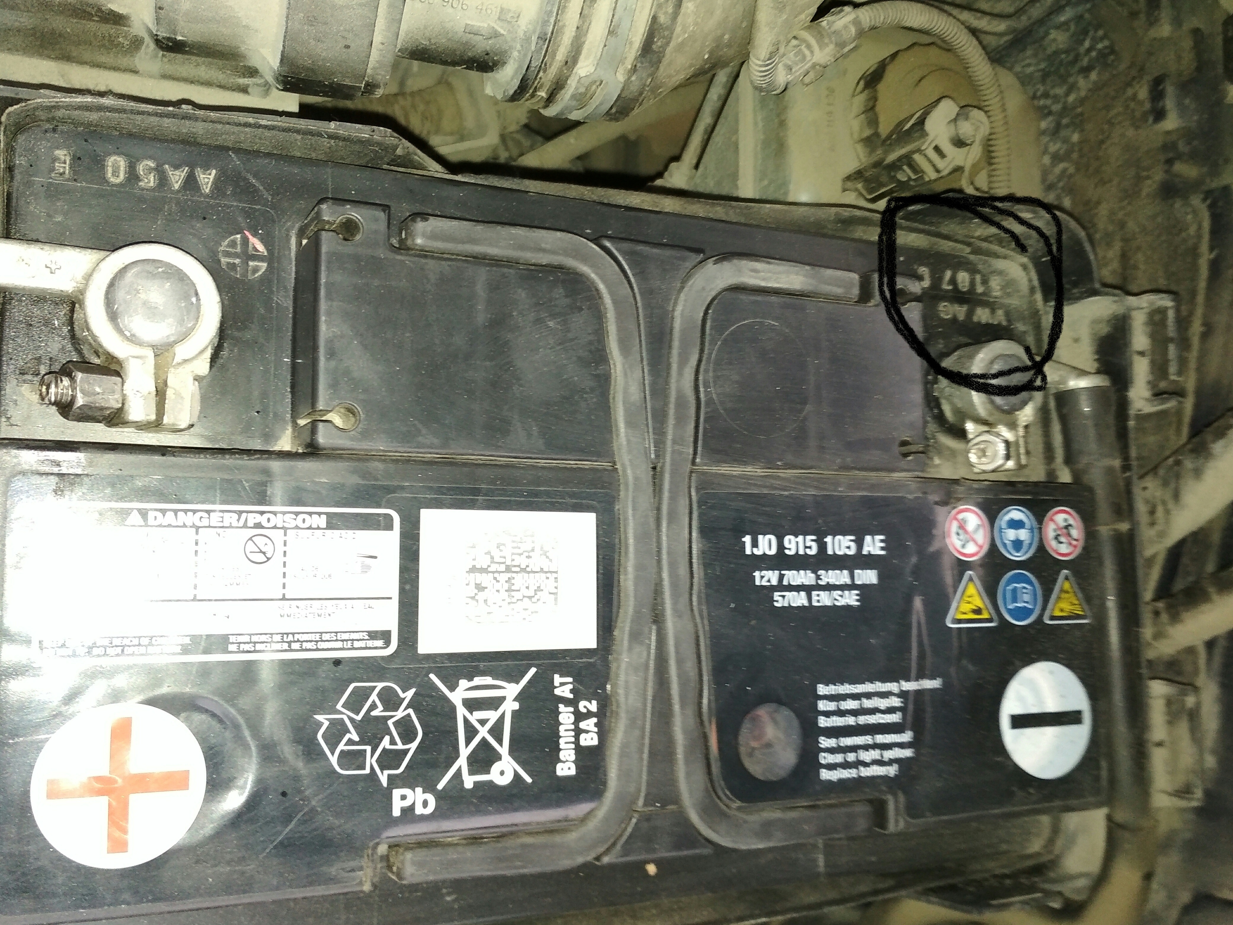 также, полезная инфа : кто хочет узнать возраст своего аккума .. посмотрите на цифры под минусовой клеммой .. первые цифры это неделя производства , вторые - год.. мой был изготовлен на 51-й неделе 2007 г.. то есть , не дожил буквально 20 недель до юбилея 10 лет